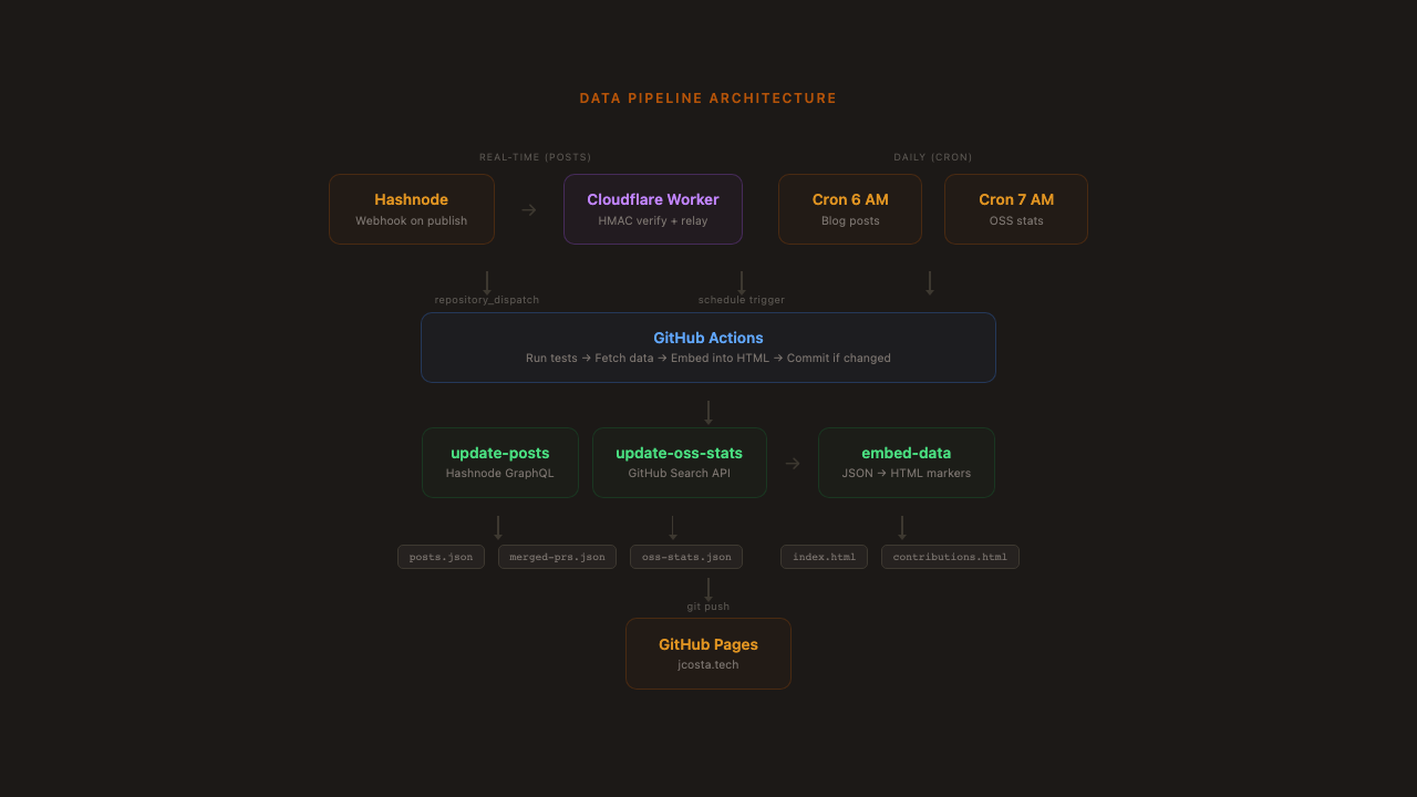 The site I replaced had exactly this problem. I'd publish a blog post on Hashnode and forget to update my portfolio. I'd merge a PR into a major open source project and my site had no idea. The portfolio was a snapshot, not a reflection.