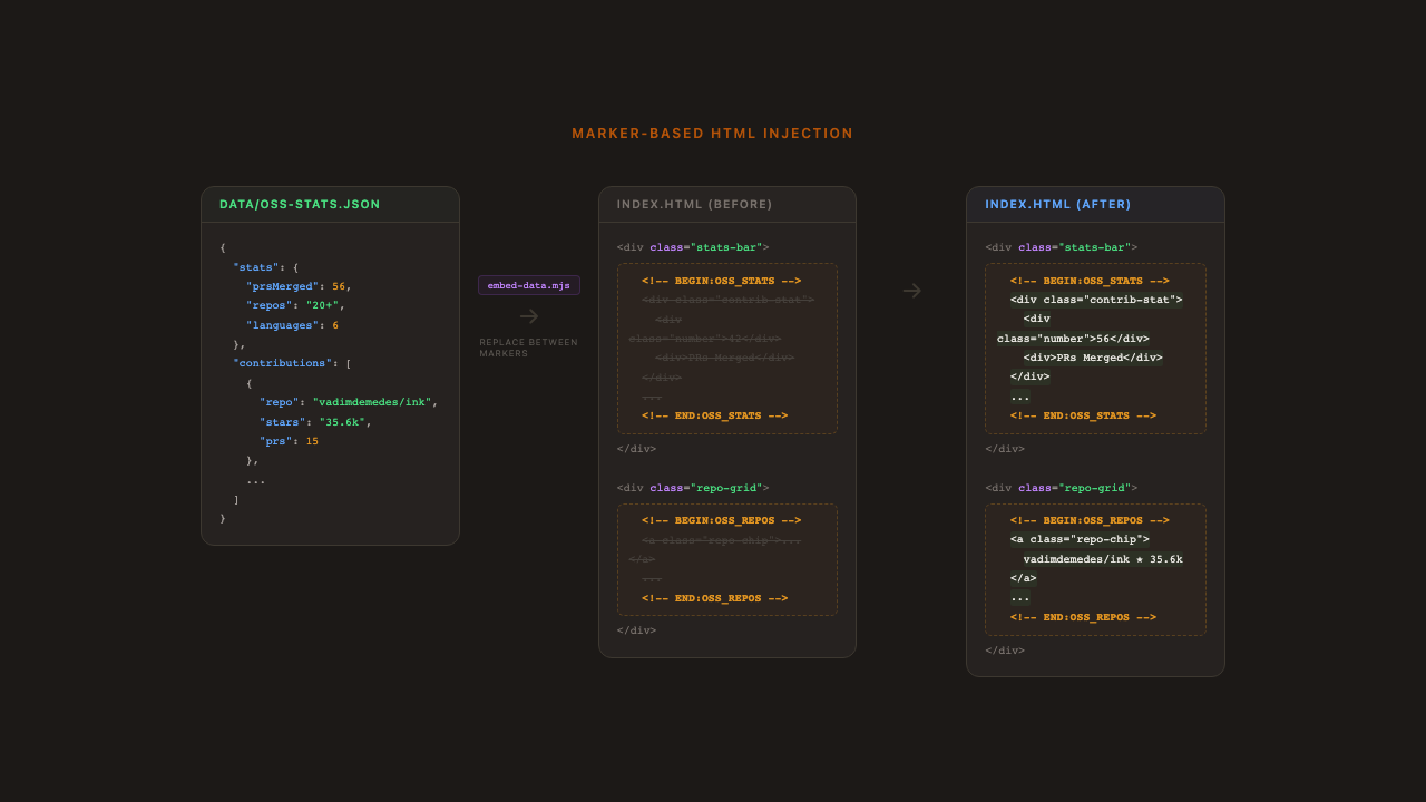 I use six marker pairs across two HTML files: four in index.html (stats, repos, recent PRs, blog posts) and two in contributions.html (stats summary, full PR list). Adding a new dynamic section means adding a marker pair and a generate function. That's it.